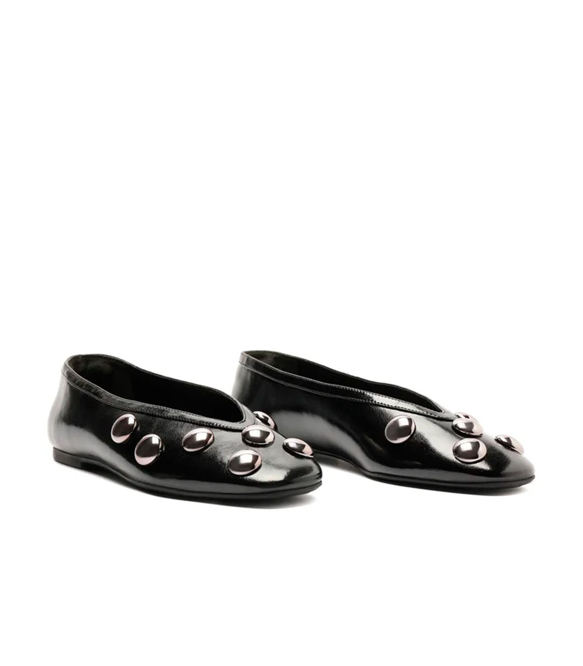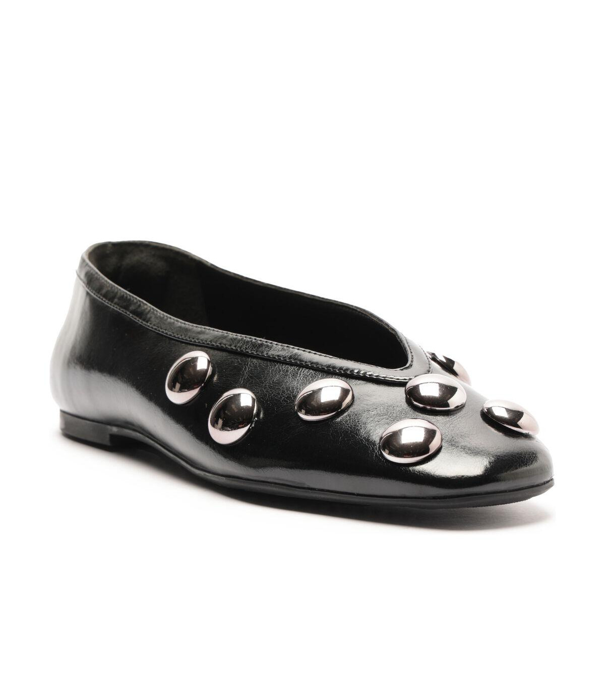 Nuestra ballerina Katy en color negro es la combinación perfecta de sofisticación y estilo moderno. Su diseño con suela baja de goma, ligero taco y punta semi cuadrada garantiza comodidad en cada paso. El acabado efecto charol, el corte triangular en el empeine y el ribete a tono, junto a las tachas plateadas, aportan un toque lleno de actitud y tendencia. Ideal para cualquier ocasión, nuestra ballerina se convierte en la pieza clave para elevar tus looks con un aire cool y a la moda. ¡Hazla tu favorita y destaca en cada outfit!