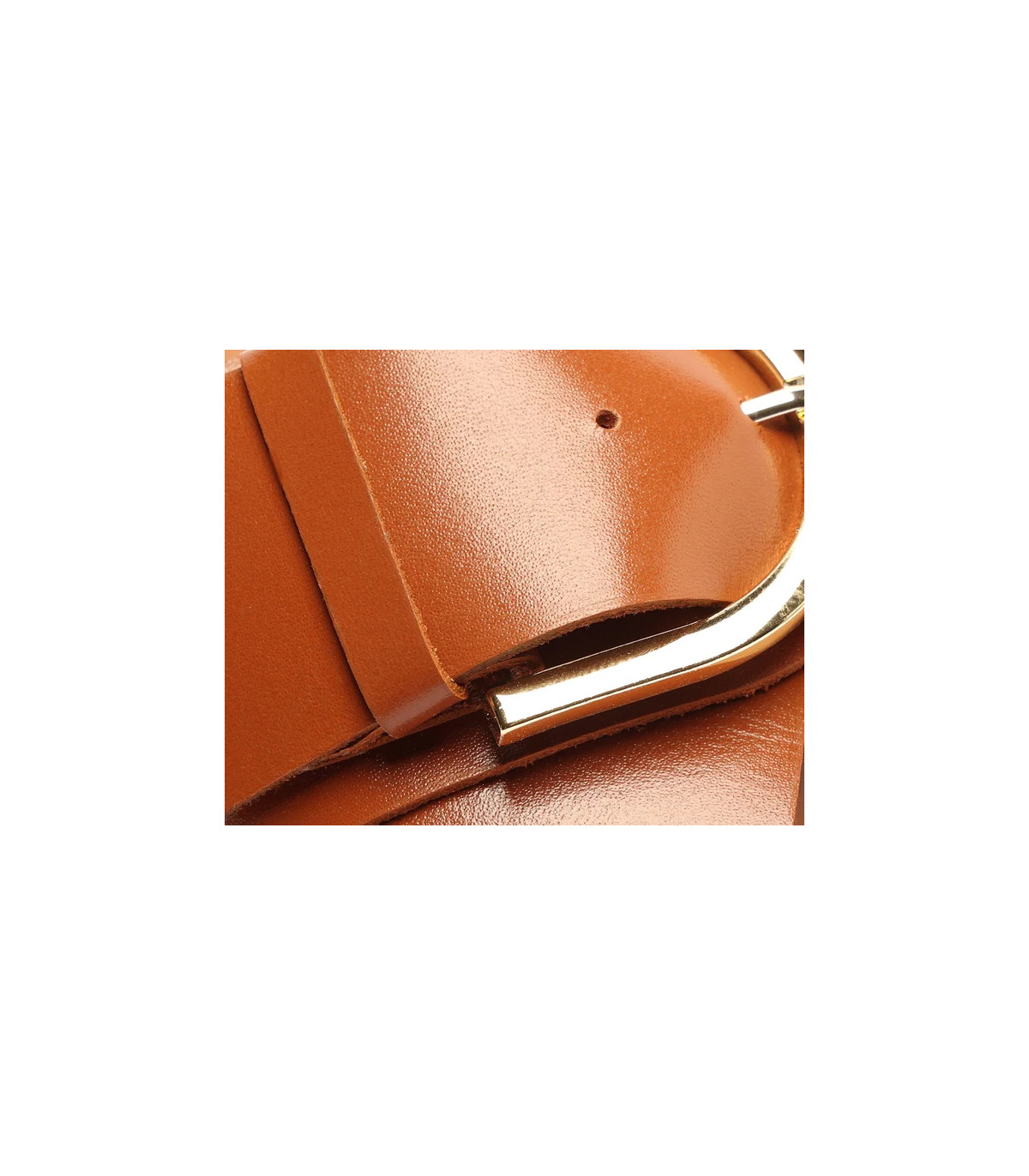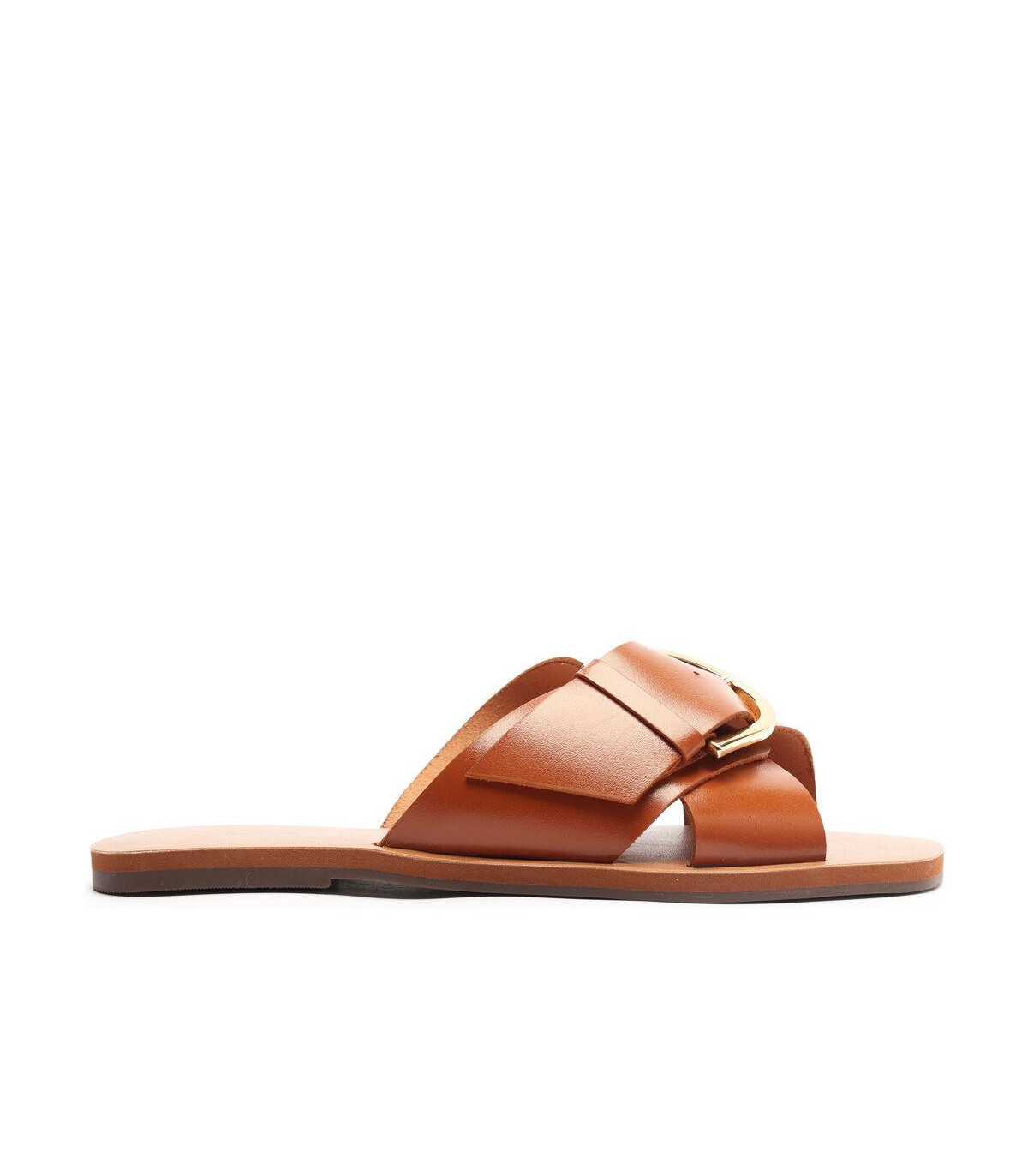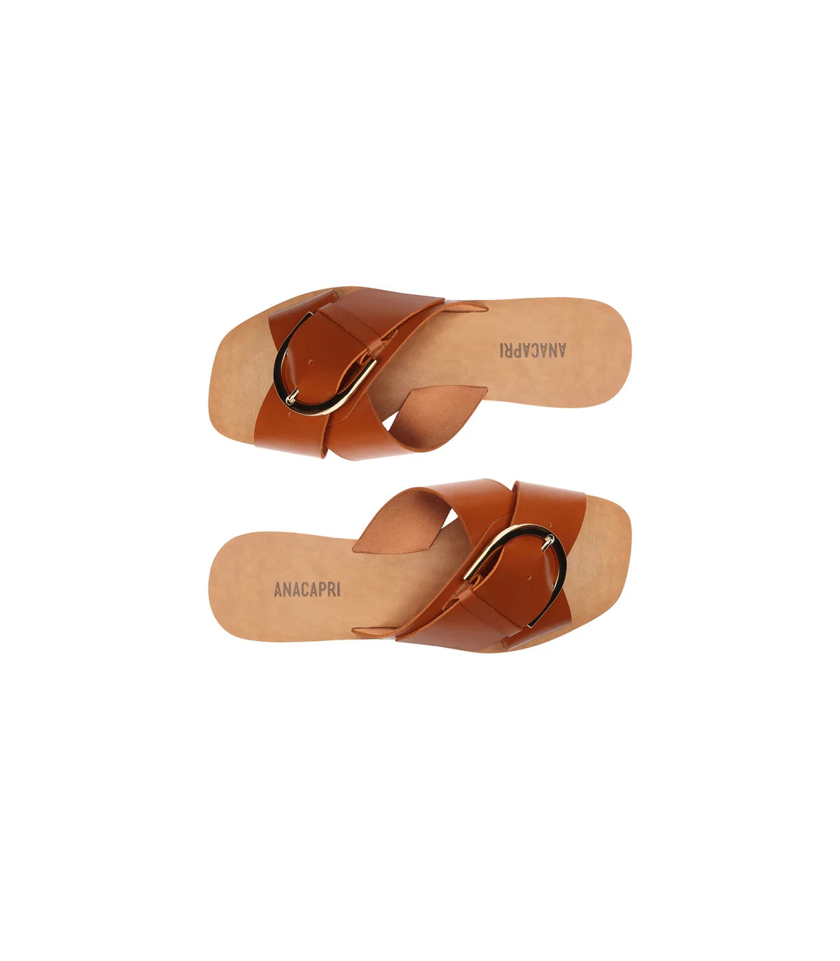 Sandalia Elise en cuero con tiras cruzadas y detalle de hebilla. El modelo presenta capellada con dos tiras anchas cruzadas en forma de X sobre los dedos y el empeine, con una maxi hebilla metálica ajustable en una de las tiras. Con puntera cuadrada moderna, plantilla marrón, suela de goma con leve tacón trasero y firma Anacapri. Sandalia abierta, deja los dedos y el talón completamente al descubierto. Recomendamos elegir una talla más que la habitual en este modelo.
