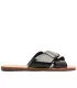 Sandalia Elise en cuero con tiras cruzadas y detalle de hebilla, en color negro. El modelo presenta capellada con dos tiras anchas cruzadas en forma de X sobre los dedos y el empeine, con una maxi hebilla metálica ajustable en una de las tiras. Con puntera cuadrada moderna, plantilla marrón, suela de goma con leve tacón trasero y firma Anacapri. Sandalia abierta, deja los dedos y el talón completamente al descubierto. Recomendamos elegir una talla más que la habitual en este modelo.