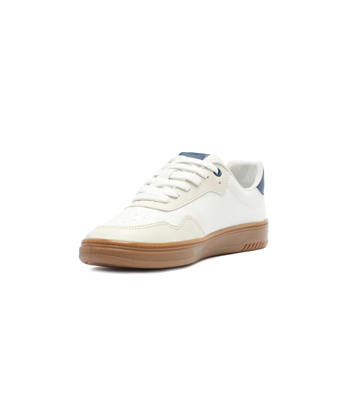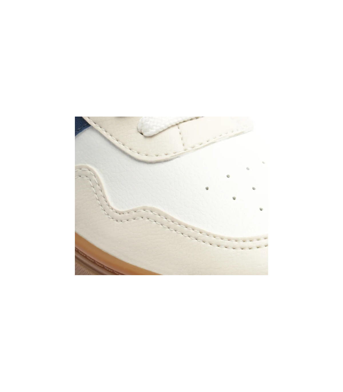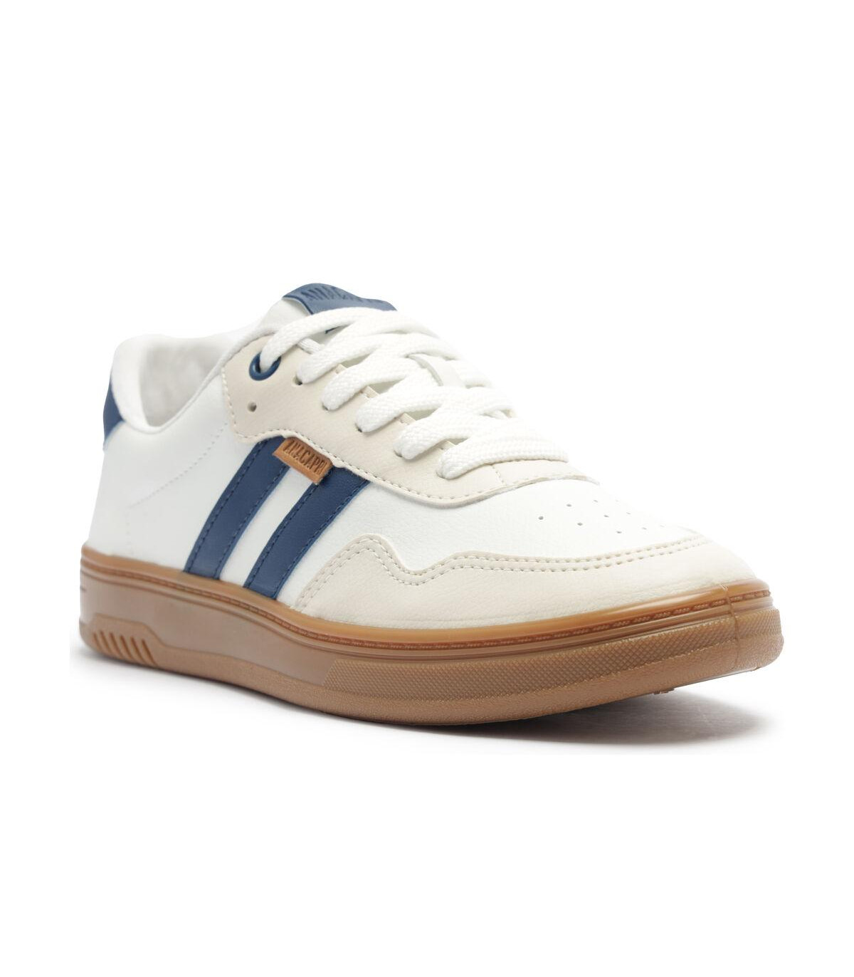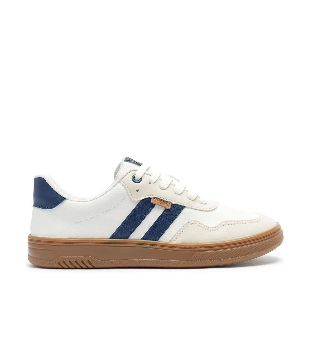Zapatilla con detalle de doble raya, en blanco y azul. El modelo presenta el diseño clásico de la zapatilla Smart A. Confeccionado en material similar al cuero, cuenta con costuras pespunteadas marcadas en el contorno de la puntera, detalles perforados en los laterales y perforaciones en la parte superior, que aportan transpirabilidad. Presenta dos rayas laterales contrastantes en azul, con aplicación trasera en el mismo tono. El diseño moderno y texturizado de la suela garantiza mayor comodidad y estabilidad al caminar. De amarre con cordones, incluye la firma Anacapri en la plantilla, etiqueta lateral marrón y etiqueta de goma Anacapri en la lengüeta.