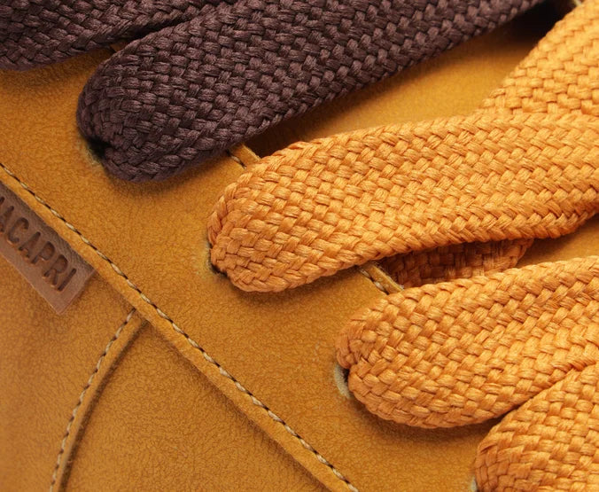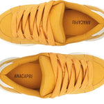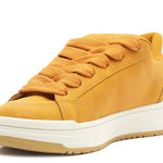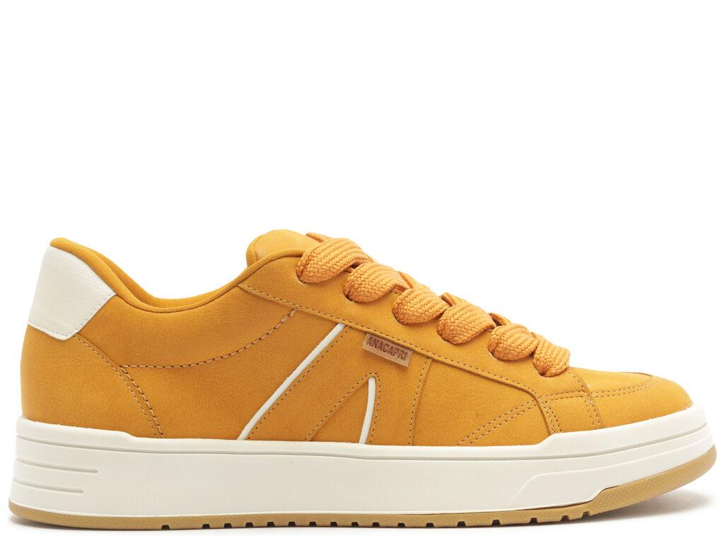 Zapatillas A'26 gamuzadas, con dos cordones, color amarillo. Con nueva construcción de suela: bicolor, goma blanca y parte trasera tipo tractor marrón. El modelo presenta costuras visibles en los laterales y contornos, con detalle en pieza de napa blanca en la parte trasera y piezas de ante aplicadas en la lengüeta, puntera y talón. Se ajusta con doble cordón —el modelo incluye un cordón marrón y un cordón exclusivo del mismo tono de la zapatilla, permitiendo personalización—. Interior forrado y detalle para aplicación de pieza recortada con diseño en “A” en ante amarillo y napa blanca, con etiqueta lateral marrón Anacapri.