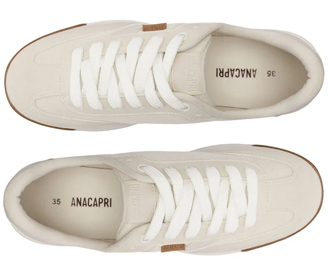 Zapatillas con plataforma con cordones, con detalle de doble franja, en beige y blanco. El modelo presenta empeine con cortes y combinación de materiales: tela de nylon y napa, con acabados en costura visible en contornos y piezas aplicadas en la puntera, lengüeta y talón. Tiene dos franjas laterales contrastantes en blanco, con pieza superpuesta en diseño de “A” aplicada en el lateral, hacia la parte trasera de la zapatilla. La parte trasera es de napa blanca y los cordones del mismo tono que la zapatilla. La suela con plataforma es de goma vulcanizada, tipo tractor marrón, con detalle en blanco.