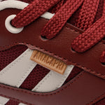 Zapatillas con plataforma con cordones, con detalle de doble franja, en rojo y blanco. El modelo presenta empeine con cortes y combinación de materiales: tela de nylon y napa, con acabados en costura visible en contornos y piezas aplicadas en puntera, lengüeta y talón. Tiene dos franjas laterales contrastantes en blanco, con pieza superpuesta en diseño de “A” aplicada en el lateral, hacia la parte trasera de la zapatilla. La parte trasera es de napa blanca y los cordones del mismo tono que la zapatilla. La suela con plataforma es de goma vulcanizada, tipo tractor marrón, con detalle en blanco.