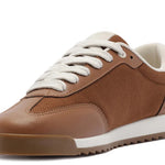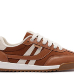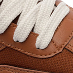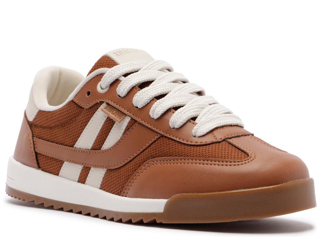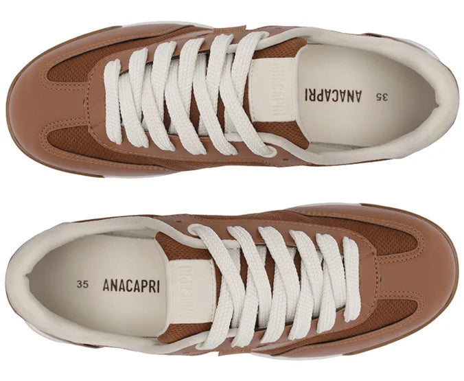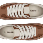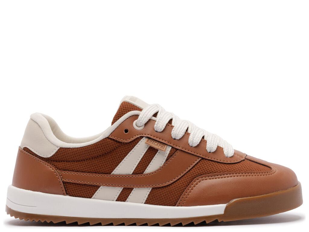 Zapatillas con plataforma con cordones, con detalle de doble franja, en marrón y blanco. El modelo presenta empeine con cortes y combinación de materiales: tela de nylon y napa, con acabados en costura visible en contornos y piezas aplicadas en puntera, lengüeta y talón. Tiene dos franjas laterales contrastantes en blanco, con pieza superpuesta en diseño de “A” aplicada en el lateral, hacia la parte trasera de la zapatilla. La parte trasera es de napa blanca y los cordones del mismo tono que la zapatilla. La suela con plataforma es de goma vulcanizada, tipo tractor marrón, con detalle en blanco.