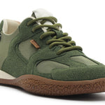 Zapatillas casuales en tono verde con mezcla de materiales. el modelo presenta puntera redondeada y suela baja de goma, con base texturizada que garantiza mayor adherencia y seguridad al caminar. el empeine combina acabado aterciopelado y paneles de tela, creando un contraste moderno y con personalidad. el cierre es con cordones, incluyendo dos opciones: uno en tono neutro y otro del mismo color de la zapatilla, ofreciendo versatilidad para combinar con diferentes looks. un detalle lateral discreto con etiqueta aplicada refuerza el toque contemporáneo del modelo. Un básico infaltable para tu día a día, que combina estilo y comodidad. Diseño versátil, fácil de combinar e ideal para complementar cualquier look.